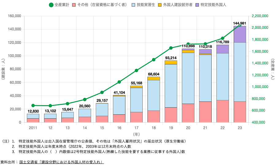 建設分野で活躍する外国人の数は、2011年の約1.2万人から、2023年には約14.5万人へと大幅に増加しました。
