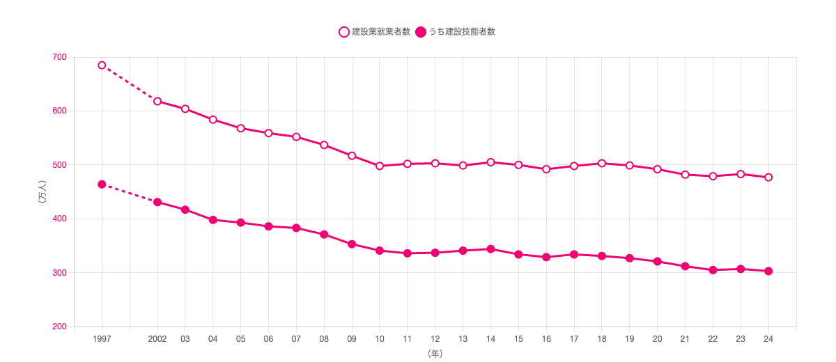 国土交通省の調査によると、建設業就業者の数は平成9年度にくらべて、令和6年度には約30%減少しています。