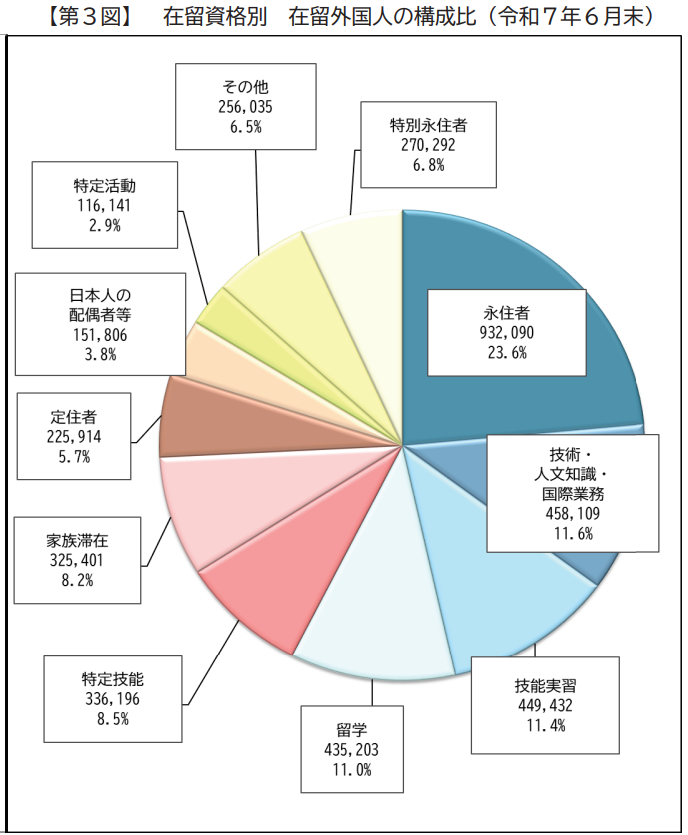 出入国在留管理庁が公表している「令和7年6月末現在における在留外国人統計」によると、在留外国人数は3,956,619人です。在留資格別の内訳は以下のとおりです。