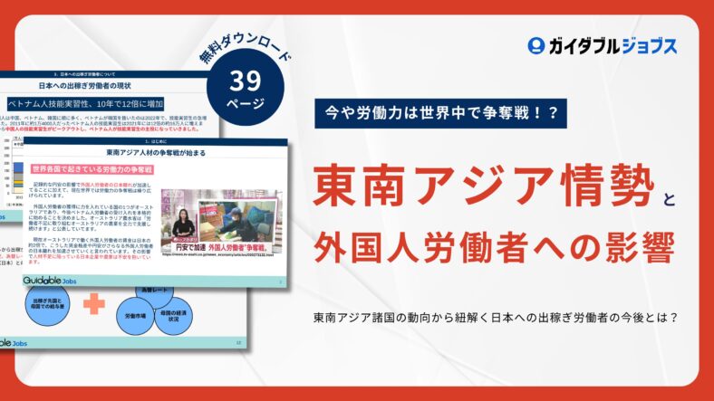 急速に変化する東南アジアの経済情勢は、外国人労働者の流動性や労働市場に大きな影響を与えています。本資料では、東南アジア地域の政治・経済の動向がどのように外国人労働者の移動や雇用に影響を及ぼしているのかを分析します。さらに、人材マネジメントの方法など、採用後のサポートについても掲載しております。是非ご覧ください。