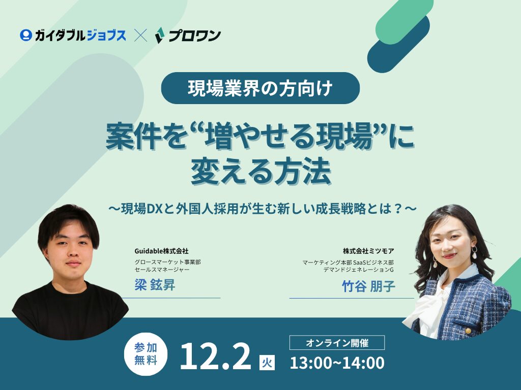 本ウェビナーでは、現場業務の効率化を支援する 株式会社ミツモア様と、外国人採用支援を行う Guidable株式会社の2社が、現場改革によって案件拡大を実現するための具体的なアプローチを事例とともに解説します。
