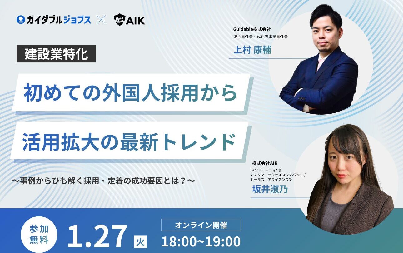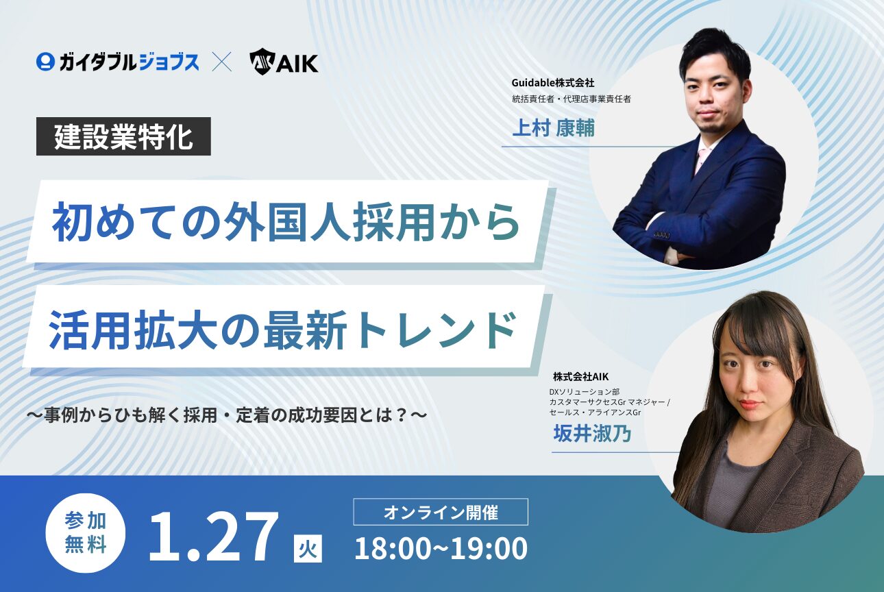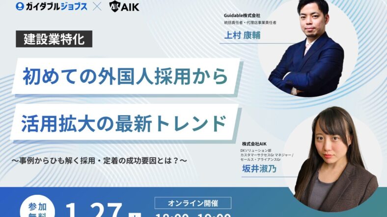 本ウェビナーは、外国人採用のプロフェッショナルであるガイダブル社と、DX推進ソリューションを提供しているAIK(アイク)社による共同開催です。